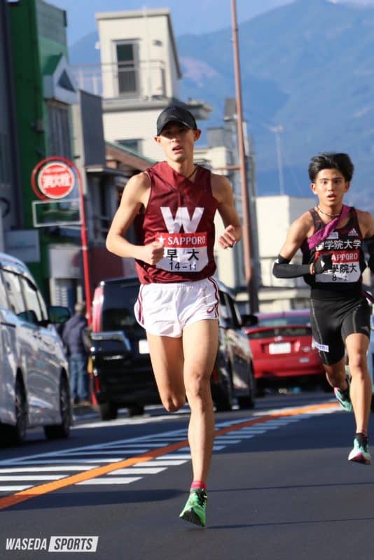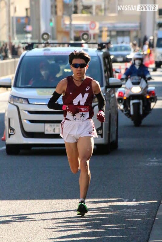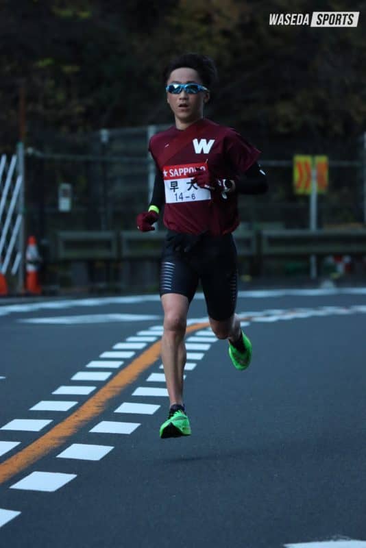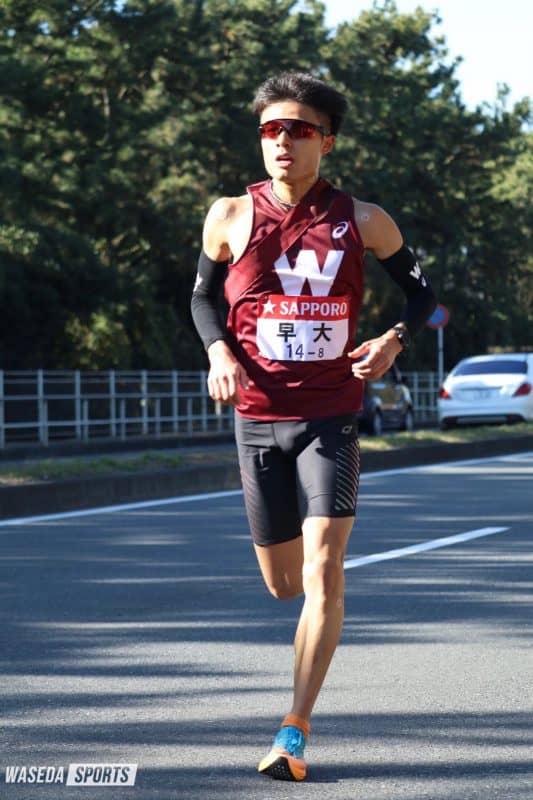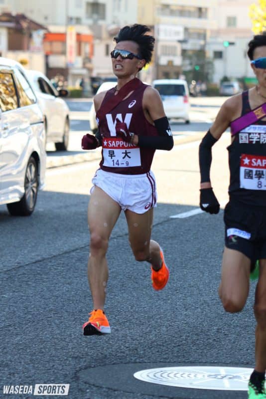 8区を任されたのは伊福陽太(政経2=京都・洛南)。これがエンジデビュー戦となった。前半こそ単独走の中で国学院大からじわりじわりと離されていったものの、しっかりと自分のペースを刻み続け、大きく差は広げられないまま後半へとレースを進めた。そして後半の遊行寺の坂で広げられていた差を逆に詰めていくと、18キロ付近でついに国学院大を捉える。一時は前に出たものの、最終盤のスパート合戦でわずかに及ばず1秒差で9区へとタスキをつないだ。