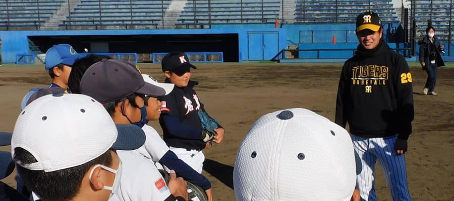 阪神の岩崎優と高橋遥人、野球少年・少女に内野守備指導 すぐにグラブを出したくなる気持ちを抑えると、ゴロを捕球できる確率が…