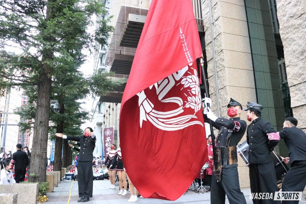1月2日の早朝、応援部の姿は大手町にあった。下級生を中心に応援活動の準備を進める。全体集合ののち、朝7時を迎えるとついに各大学の応援が一斉に始まった。早大は『紺碧の空』からスタート。間垣皓介旗手(スポ3=宮城・仙台一)によって大校旗が高らかに掲揚され、永田新代表委員主将(教3=静岡・掛川西)を中心に校歌を3番まで振る。3年ぶりに第一応援歌と校歌が大手町の地に響いた。校歌を終えると、応援曲メドレーを繰り返す。早稲田を代表する応援曲の数々に、早朝から足を運んだ多くの観客も手拍子で盛り上がった。濃いエンジに染まった腕章を巻いたリーダー4年生が堂々とセンターリーダーを務めると、途中ではリーダー下級生もセンターリーダーを務めあげた。バンド演奏曲『SMILY』ではチアリーダーズが笑顔と演技で元気をもたらす。日の出から間もない寒さの中、観客の心を温め、早大全体の士気を確実に高めた。スタート時刻の8時に近づくと、応援曲メドレーを『コンバットマーチ』で締め、『紺碧の空』へ。1区走者の間瀬田純平(スポ1=佐賀・鳥栖工)を温かく送り出した。