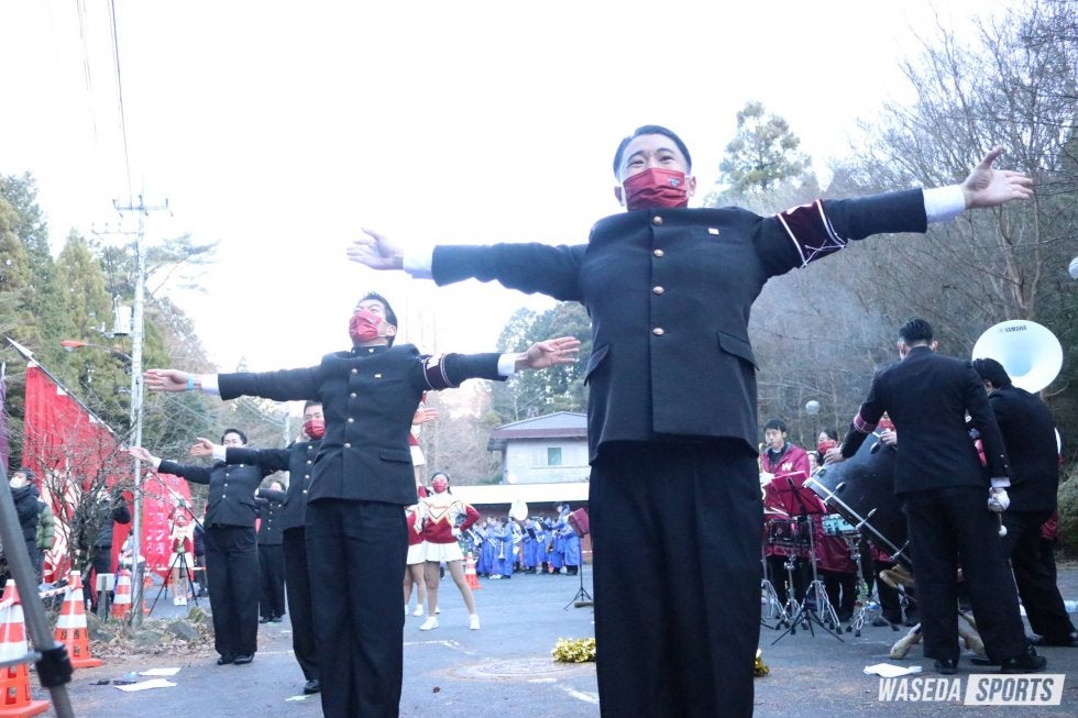 総合順位を決する2日目。極寒の中、早朝にホテルを出発すると、準備ののち、この日も出走1時間前から応援が開始された。前日と同様、応援曲メドレーを繰り返すが、この日の芦ノ湖では『幸せの歌』『早稲田の翼』『大地を踏みて』『いざ青春の生命のしるし』など多くの応援歌を披露。バリエーション豊かな応援に加え、下級生も反省を踏まえ、より一層力を込めて演奏や応援に勤しんだ。出走時刻の8時を迎えると『コンバットマーチ』から『紺碧の空』へと切り替え。6分後、北村光(スポ3=群馬・樹徳)を見送り、応援部はすぐさま最終地点の西新橋へ向かった。