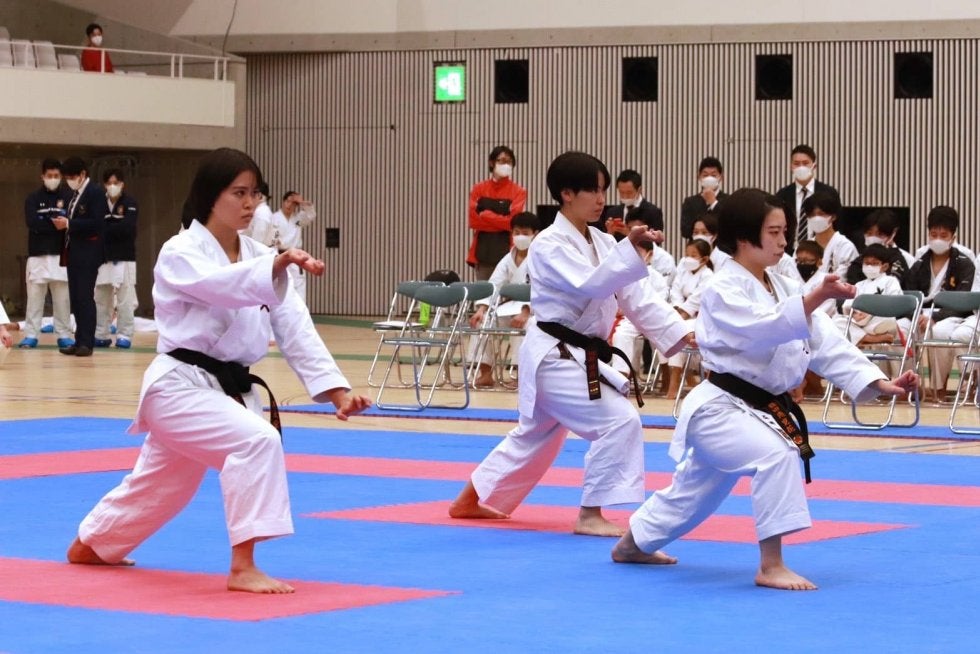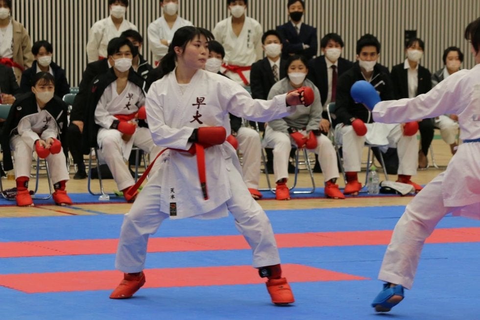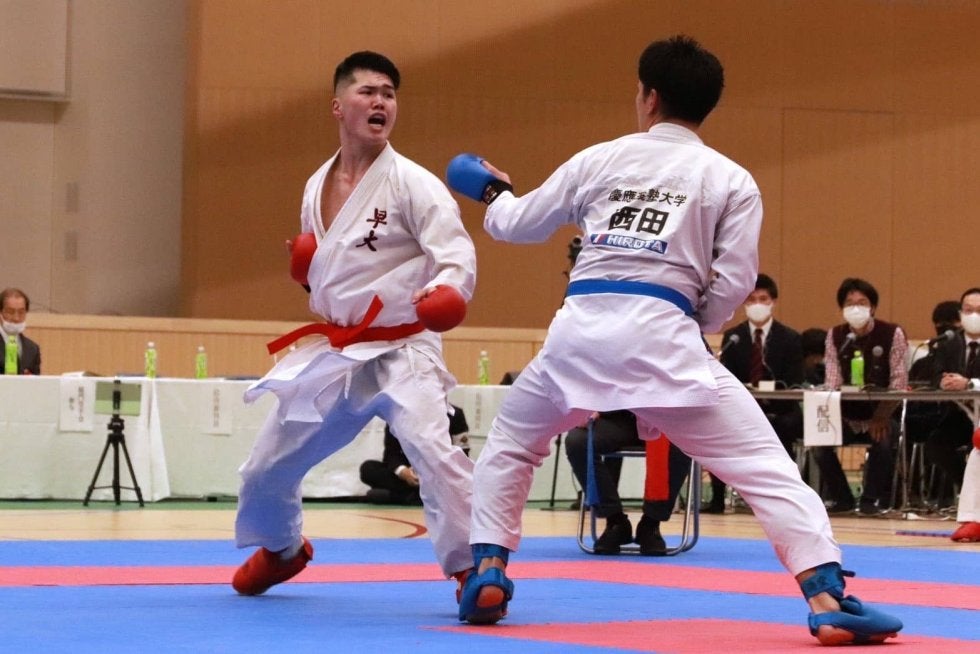 最初に行われた形演武では、秋吉優斗(スポ1=埼玉・埼玉栄)が個人形を、益田恵理花(創理4=東京・早実)、岡部茉莉(創理3=千葉・柏)、酒井春帆(スポ3=東京・国分寺)が女子団体形を、岩渕凌(スポ1=茨城・水城)、熊谷拓也(スポ2=東京・世田谷学園)、吉田蒼一朗(スポ2=東京・世田谷学園)が男子団体型を披露。慶大を圧倒する気迫の籠った演武が、来たる戦いに備えた組手選手たちの背中を押す。