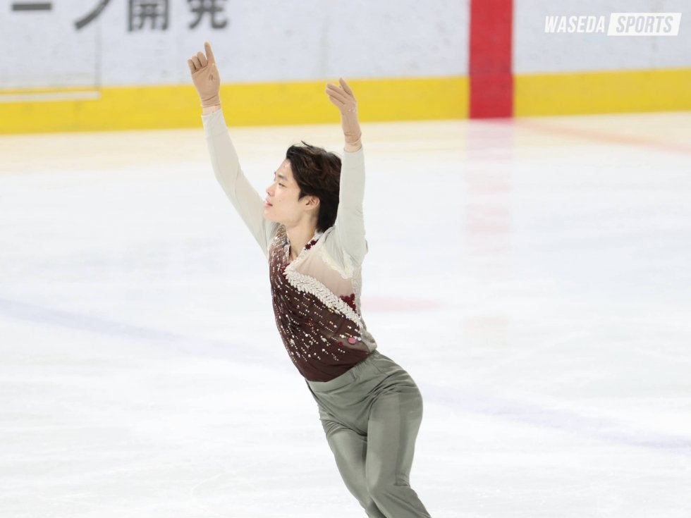 早大勢最後に登場した川畑和愛(社3=沖縄・N)。ジャンプがなかなか戻らず、苦戦を強いられてきた今シーズン。11月の東日本選手権後に少しの休養を取り、12月初めに練習を再開して準備を重ねてきたという。初のインカレの舞台に立った川畑は、笑顔でリンクに登場し、落ち着いた様子で最初のポーズを取った。持ち前のスピードのある滑りでジャンプの軌道へ入ると、2回転ルッツ+2回転トーループの連続ジャンプ、2回転アクセルを加点の付く出来栄えで着氷する。そして3本目は、直前まで入念に確認していた3回転サルコウ。回転不足の判定を受けるが、「自分の中でも綺麗に跳べた」と語ったように、しっかりと決めた。続く3回転ループは回転が足りず乱れたが、東日本選手権で転倒が続いた3回転ジャンプを降りた。後半3本のジャンプも大きな過失なくまとめると、ヴァイオリンの音色に合わせてダイナミックなスケートを披露。大きなバレエジャンプやランジなどで魅了した。