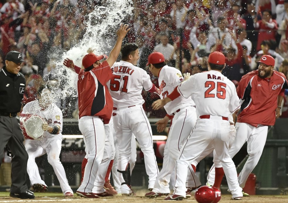 広島―オリックス 12回、サヨナラ本塁打を放ちナインに祝福される広島・鈴木(51)=マツダ【写真提供:共同通信社】 広…