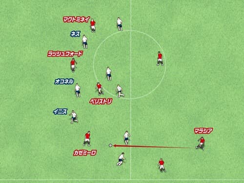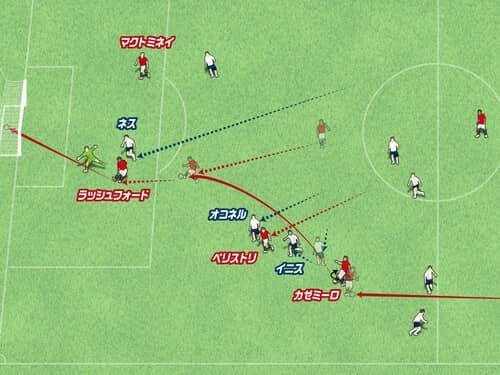 カゼミーロが振り向いた瞬間にペリストリがダイアゴナルに動き出し、オコネルはついていくしかない。それによって中央でラッシュフォードがフリーになると、カゼミーロがそこへスルーパス。ネスが絞るが間に合わず、ラッシュフォードが冷静に決めて3点目となった。