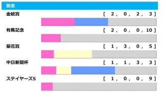 今回、上位人気が予想されるエピファニーは前走・ノベンバーS1着。過去に該当ローテはなく、クラス別成績で見れば前走・3勝クラスの成績は【1.0.1.12】。馬券に絡んだ2頭は芝2000m以上を勝利した馬であり、ここまで芝1800mしか出走歴のないエピファニーが初の芝2200mでどうかは未知数。むしろ、同じ前走・3勝クラス組でも、芝2200mを快勝してきた伏兵スタッドリーを狙いたくなる。