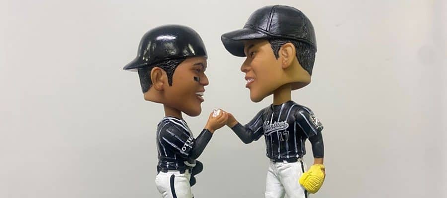 ロッテ・佐々木朗希(右)と松川虎生のボブルヘッド【写真:球団提供】