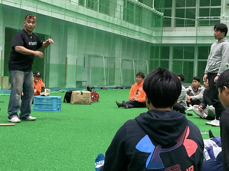根鈴氏は選手を前に、自らのキャリアを紹介し、20代のうちは積極的に世界の野球を体験して経験値を高めていくべきと話した。