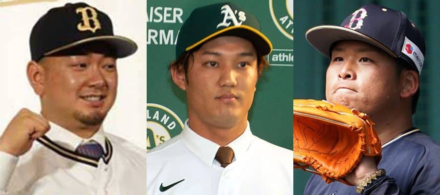 オリックス・森友哉、アスレチックス・藤浪晋太郎、ロッテと育成契約した澤田圭佑(左から)【写真:橋本健吾、ロイター、荒川祐史】