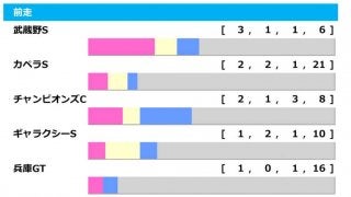 武蔵野S 【3.1.1.6】 勝率27.3%、連対率36.4%、複勝率45.5% カペラS 【2.2.1.21】 勝率7.7%、連対率15.4%、複勝率19.2% チャンピオンズC 【2.1.3.8】 勝率14.3%、連対率21.4%、複勝率42.9% ギャラクシーS 【1.2.1.10】 勝率7.1%、連対率21.4%、複勝率28.6% 兵庫GT 【1.0.1.16】 勝率・連対率5.6%、複勝率11.1% マイルCS 【1.0.0.0】 勝率・連対率・複勝率100%