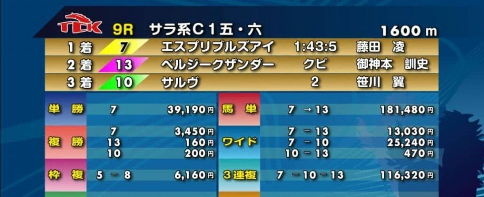 25日、大井競馬第9レース(14頭立て)において、単勝の最高配当を更新した。藤田凌騎乗の13番人気エスプリブルズアイ(…