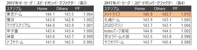 ただ、西武の投手陣が軒並みスケールアップして球速の底上げに成功した可能性もゼロではない。そこでより正確にスピードガンの実態を測るため、パークファクターという指標の手法を用いて球速のデータを検証した(表3,4)。パークファクターとは特定の球場で計測された結果が他の球場と比較して偏りがあるかを判定するもので、通常は本塁打や得点などの傾向を測るために用いられる。本拠地とそれ以外の球場の値の比率で表され、1より大きいほど本拠地で発生しやすい(高く出やすい)事象であることを示している。なお、球速データは投手個人の資質や登板環境に左右されると思われるため、下記の条件で対象となるデータをある程度絞っている。