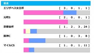 過去10年、最多3勝を誇るのは前走・エリザベス女王杯組【3.0.1.1】。唯一、馬券外に沈んだのは2013年10番人気6着のスマートシルエットのみで、本馬はエリザベス女王杯で最下位となる16着からの参戦だった。
