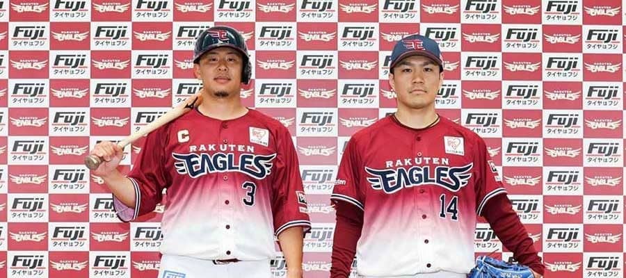 「FANS'ユニホーム2023」を着用した楽天・浅村栄斗(左)と則本昂大【写真:球団提供】
