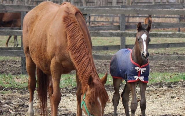 生まれて数日後、初めて放牧に出た時のノーブルライジングと母エルミラドール(スウィングフィールド牧場提供)