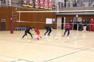 チーム単位ではなく、個人単位でのエントリーとなるこのイベントでは、朝にくじでチームが決まる仕組み。ほとんど初めて顔を合わせるメンバーのため、自己紹介の後にミニゲームが行われた。9個並んだマーカーコーンを使い、自チームの色を3つ並べる〇×ゲームリレーや、オーバーハンドパスをつなぎ、バスケットゴールに入れるリレーでアイスブレイクをした。