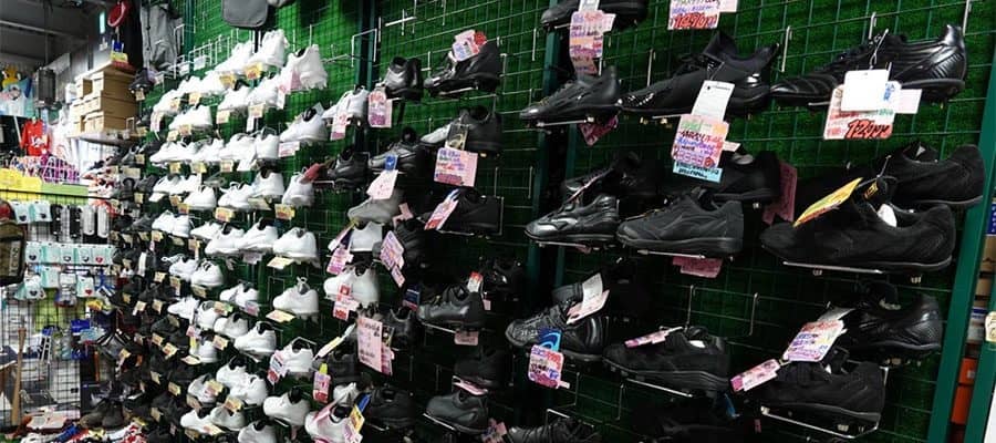 西日本最大級の野球専門店「ミチイスポーツ」のスパイクコーナー【写真:橋本健吾】
