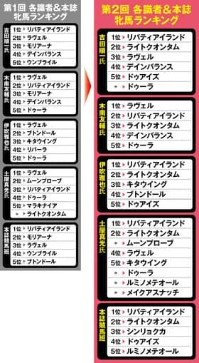 ※『Sportivaオリジナル番付』とは、デイリー馬三郎の吉田順一記者、日刊スポーツの木南友輔記者、JRAのホームページでも重賞データ分析を寄稿する競馬評論家の伊吹雅也氏、フリーライターの土屋真光氏、Sportiva編集部競馬班の5者それぞれが、今春のクラシックを目指す3歳牝馬の、現時点における実力・能力を分析しランク付け。さらに、そのランキングの1位を5点、2位を4点、3位を3点、4位を2点、5位を1点として、総合ポイントを集計したもの。