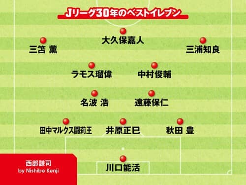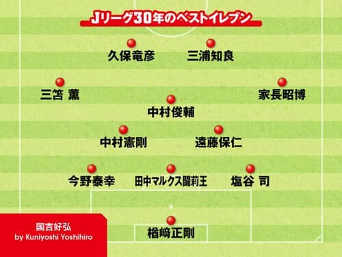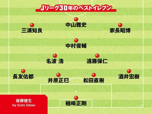 Jリーグ30年から選ぶベストイレブンということで、縛りはJ1優勝に貢献していること。中村俊輔はステージ優勝のみだが、2度MVPになっているので例外とした。Jリーグでタイトル獲得に繋がるプレーを見せ、活躍したことに加えて、見ていてワクワクさせられた選手、次の試合も見たいと思わされた選手を選んだ。