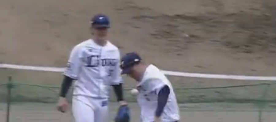 ノックで三遊間へのゴロを逆シングルで捕りにいった際、“弘法にも筆の誤り”でグラブからボールが飛び出てしまった。しかしそこは球界を代表する名手。見事な“球遊び”で浮いたボールを素早く右手で捕球し、スローイングへと繋げた。