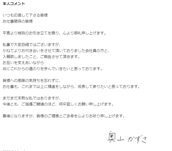 奥山かずさが結婚を発表 お相手は「会社員の方と」 | 話題の投稿