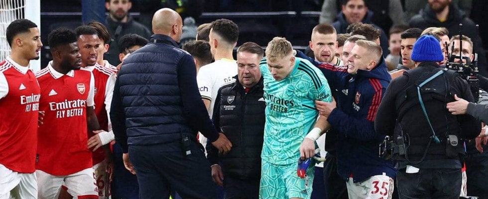NEW FOOTAGE of a Spurs fan kicking Aaron Ramsdale. This angle shows the fan climb over the barrier and onto the advertising hoarding where he then kicks the keeper, whose Arsenal beat Tottenham 2-0. Spurs have vowed to ban the supporter for life.