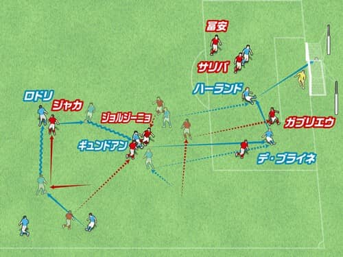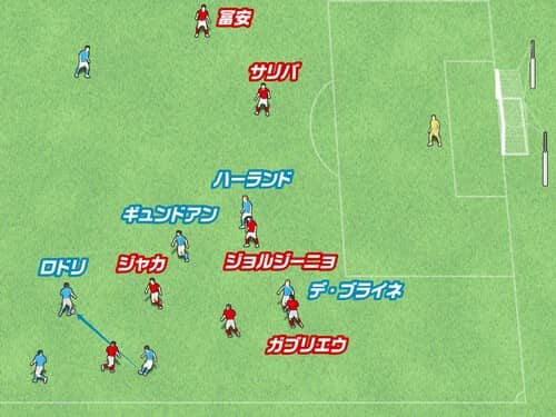 アーセナルはガブリエウと入れ替わりでジョルジーニョが詰めていくが間に合わず、ギュンドアンのスルーパスでデ・ブライネが抜け出した。そこへガブリエウが寄せに行くと、今度は中央のハーランドが空いてフィニッシュとなった。