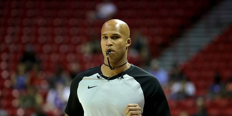 クリーブランド・キャバリアーズ在籍時には優勝メンバーの一員となり、現役引退後は『EPSN』のアナリストとしてメディアに登場しているジェファーソン。この日はセレブリティゲームを解説席から見守っていたが、第2クォーターに入ると仕込んでいた審判服を披露し、突如レフェリーとして試合に飛び入り参加した。