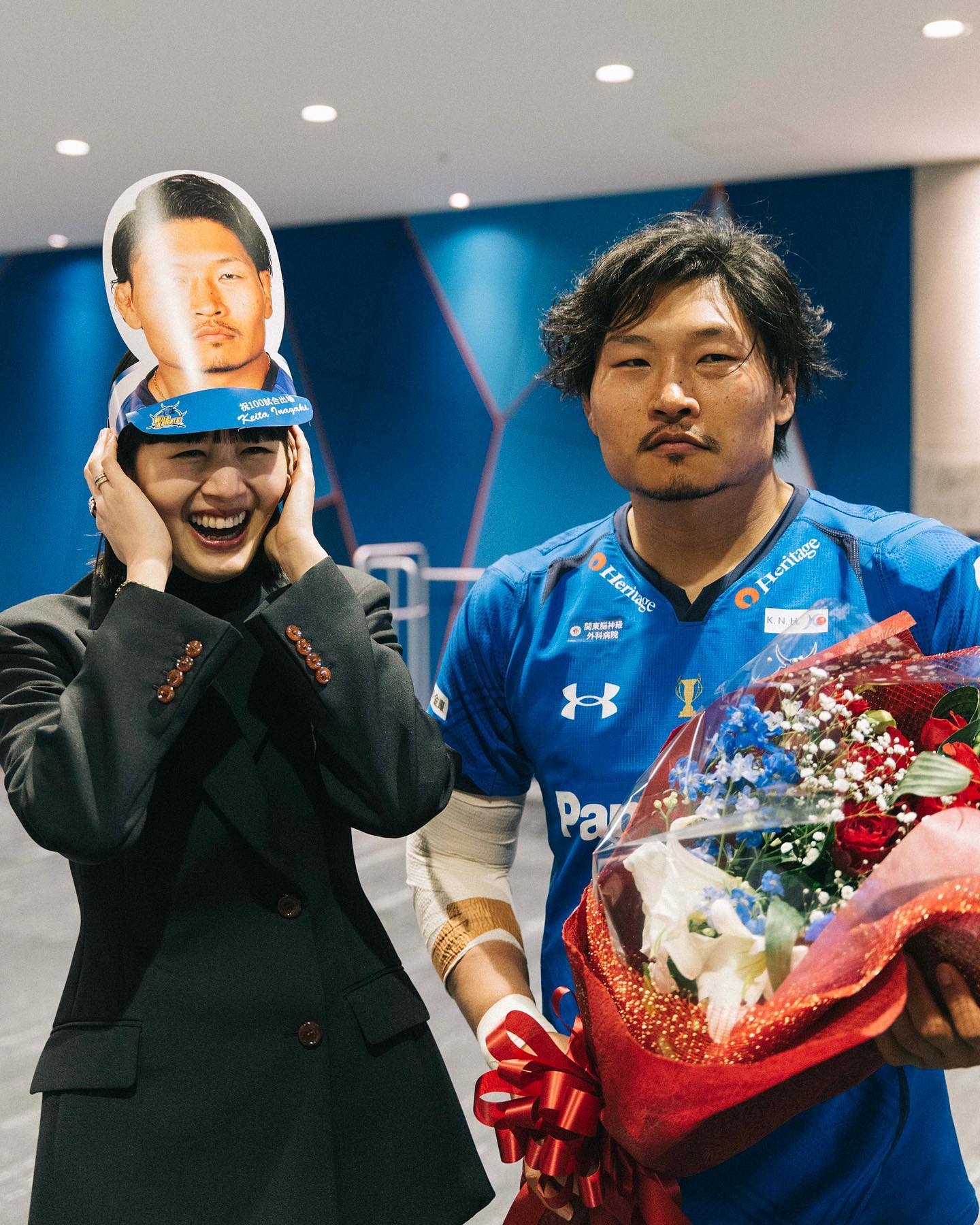 ラグビー稲垣啓太の妻・新井貴子が夫のリーグ戦通算100試合出場を祝福🏉💐 | 話題の投稿