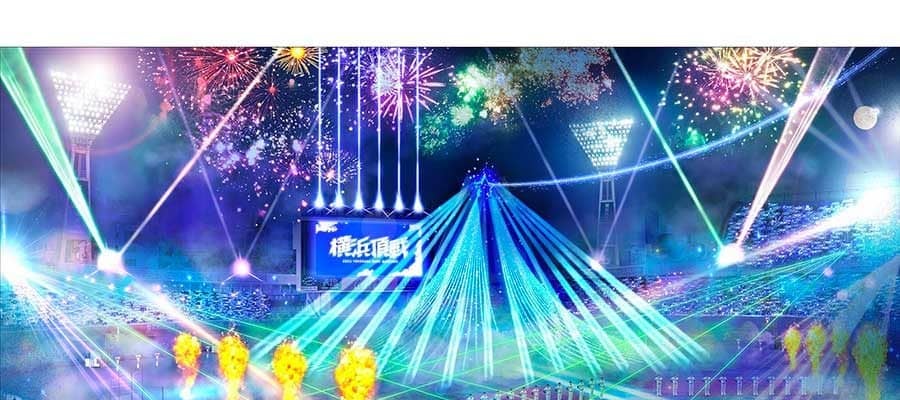 テーマは「頂への青き一本道」。光で山を描き、新ホームユニホームの象徴である「YOKOHAMA STRIPE」を表現した“道”を選手たちが駆け上がる様を演出するという。当日の来場チケットに付いてくる「YOKOHAMA STRIPE 選手名タオル」をファンが掲げることで、スタンドで彩られるという。