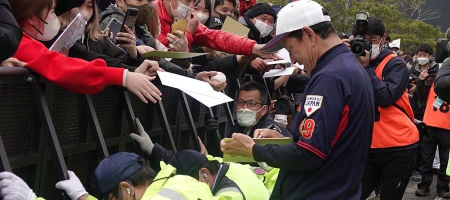 野球日本代表「侍ジャパン」の宮崎キャンプには23日も、悪天候にもかかわらず大勢のファンが詰めかけた。連日、サインを求めるファンの圧で柵が壊れるというアクシデントが続く中、栗山英樹監督は“厳重警戒”の中でサインに応じた。