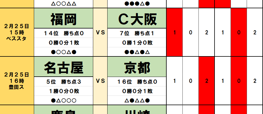 今回のtotoではJ1第2節の8試合とJ2第2節の5試合が対象となっている。過去のデータや直近の様子などから、分析を進…
