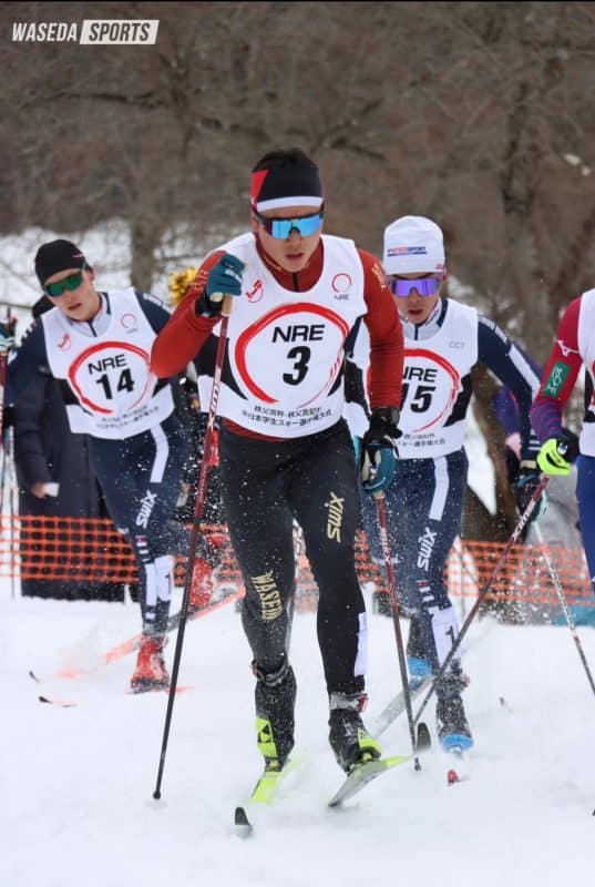 このレースは5キロのコースを6周するかたちで行われる。早大からは6人が出場した。レースは序盤から 星野誉貴(スポ4=群馬・利根商)主将が積極的に前に出て、集団を引っ張るかたちとなった。今年が最後のインカレとなる星野がこのレースにかける思いは強い。力強い滑りでレースを進めた。星野のやや後方でレースの様子を伺っていたのは、大堰徳(スポ2=岩手・盛岡南)。国民体育大会から1週間も経っておらず、万全とは言えない状況であったが落ち着いてレースを進めた。レースプランは「後半上げて勝負」。その言葉通り、4周が終了した地点でトップに立った。5周目に2位に下がるも、その後は順位をキープ。2位でゴールした。一方で星野はレース後半から先頭からやや後退。しかしラストの意地を見せ、9位入賞でレースを終えた。安定した滑りを見せたのは滝沢育矢(スポ1=新潟・十日町)。序盤から大きなブレのないタイムでラップを刻み冷静にレースを進め、初のインカレで10位入賞を成し遂げた。3年の橋本礼徳(スポ3=長野・飯山)は、前半は先頭集団に位置づけ、勢いのある滑りを見せるも後半に失速。26位でのゴールとなった。山崎大翔(スポ2=富山・南砺平)は1周目で転倒するトラブルがあったものの、その後は落ち着いた走りを見せ、3、4周目はトップのラップタイムを記録。しかし転倒で出遅れた影響で、17位でのゴールとなったが、ゴール後にはチームメートの出迎えに笑顔も覗かせた。滝沢と同じくルーキーの小池駿介(スポ1=北海道・富良野)は1周目は9位につける好スタート。その後は粘りを見せるも順位を落とし、40位でゴール。ゴール後には苦しそうな表情を見せ、レースを終えた。クロスカントリー男子30キロクラシカルでは大堰、星野、滝沢の3人が入賞を果たし、チームに12点が加わった。