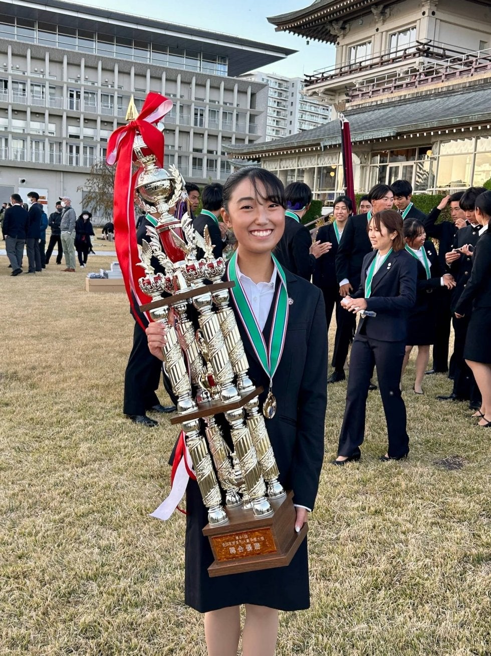 3連覇をつかんだ全日本インカレでの表彰式。優勝トロフィーを手に笑顔を見せた