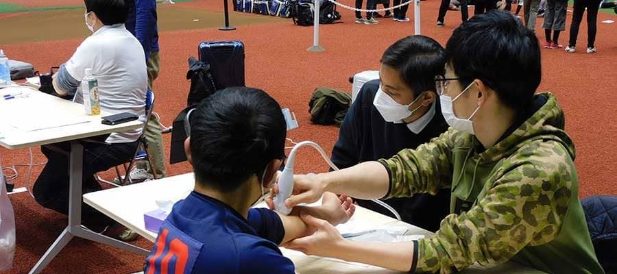 肩肘検診では問診で選手の体の状態を確認した後、エコーで肘をチェックした。会場を訪れた小学校高学年から中学生まで83人のうち、8人に問題が見つかり病院での再受診が勧められた。