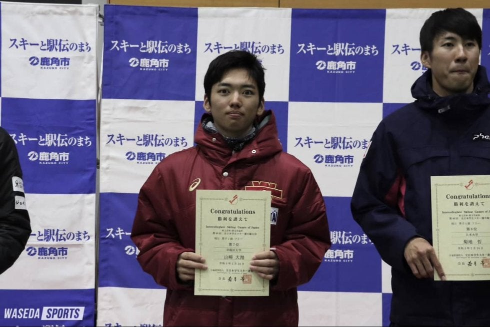 クラシカルに引き続き、フリーには星野誉貴(スポ4=群馬・利根商)主将、橋本礼徳(スポ3=長野・飯山)、大堰徳(スポ2=岩手・盛岡南)、山崎大翔(スポ2=富山・南砺平)、小池駿介(スポ1=北海道・富良野)、滝沢育矢(スポ1=新潟・十日町)の6人が出場した。この日、輝きを見せたのは2年の山崎。「30キロのレースの翌日で疲労がすごかった」と語ったが、それを感じさせない力強い走りを見せ、見事7位入賞。この種目で早大からは山崎のみが入賞となった。クラシカルで入賞した大堰と星野は12位と20位。インカレ最終日のリレーに期待が持ち越される結果となった。同じくクラシカルで入賞した滝沢は16位。クラシカルと比べ順位を落とすも、ルーキーとは思えない安定した走りを見せた。滝沢と同じくルーキーの小池は、クラシカルでの不調ぶりを1日で修正し、今後の活躍に期待が高まる走りを見せ、18位でゴールした。3年の橋本は大堰に続く、13位でゴール。前日の26位から大きく順位を上げる走りとなった。