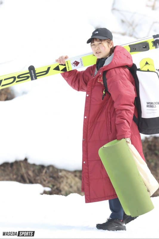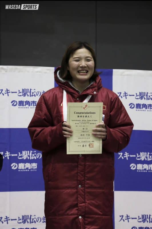 ノルディック複合の女子はオープン種目。インカレでチームの得点とはならないが、早大の選手が活躍を見せた。出場したのは宮崎彩音(スポ2=長野・飯山)。クロスカントリー、ジャンプでともに圧倒的な実力を見せつけた。前半のジャンプでは宮崎のみが40メートル台を記録し、2位と30点近い差をつけた。その後行われた5キロのクロスカントリーでは、ジャンプの記録によりスタート時間に差がつけられるため2位に2分近くの差をつけてスタート。その後も快走をみせ、差を広げ2位に約5分の差をつけゴール、優勝を決めた。