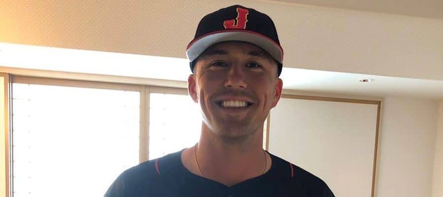 来日すぐ名古屋入り、宿舎で早速侍ユニを着用 野球日本代表「侍ジャパン」に日系選手として初選出されたラーズ・ヌートバー外野…