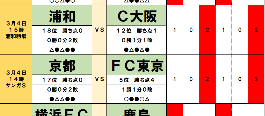 今回のtotoではJ1第2節の8試合とJ2第2節の5試合が対象となっている。過去のデータや直近の様子などから、分析を進…