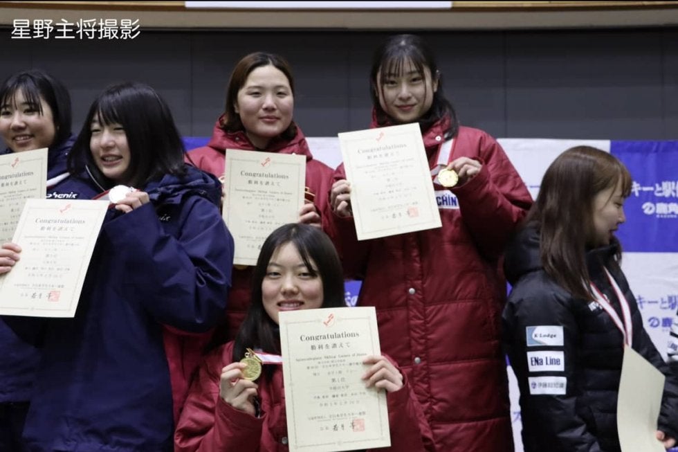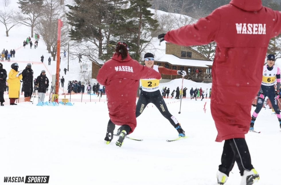 女子リレーは1人あたり2.5キロのコースを2周、5キロを3人でつなぐ。女子はクラシカル、フリーでともに入賞を果たした本田千佳(スポ3=秋田・花輪)、鎌倉春音(スポ1=長野・白馬)、中島果歩(スポ1=長野・飯山)が出走した。第1走者は中島。反省点があると振り返ったが、ルーキーらしい元気のある走りで「楽しんで、余裕をもって滑ることができた」と語った。中島の走りで早大は2番手で第2走者の鎌倉へとつないだ。鎌倉は2位でつながれたバトンを、トップへと引き上げる軽やかな滑りを見せる。これまでの走りで見せた実力を発揮し、早大は首位に踊り出た。アンカーの本田は圧巻の走りを見せる。2種目で上位入賞を決めた実力はまさに「圧倒的」。2位の日大の選手に10秒以上の差をつける区間タイムで走り抜け、ゴール前に日大の選手とともに登場。そして日大の選手を振り切り、中島、鎌倉が待つゴールへとトップで飛び込んだ。