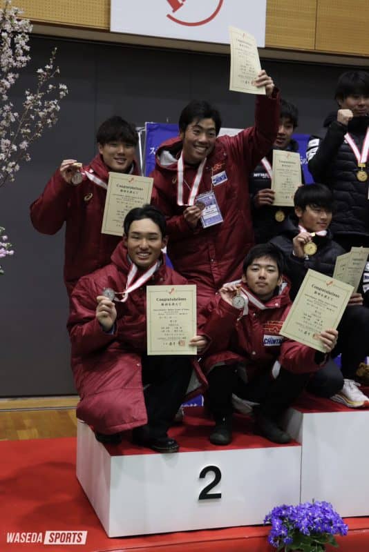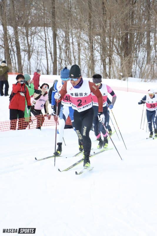 男子リレーは1人7.5キロを4人でつなぐレース。星野誉貴(スポ4=群馬・利根商)主将、橋本礼徳(スポ3=長野・飯山)、大堰徳(スポ2=岩手・盛岡南)、山崎大翔(スポ2=富山・南砺平)が出場した。第1走者は星野。星野は1周目から先頭で力強い走りを見せる。その後もトップを渡さず、最後のインカレで、最後の種目で、執念の走りを見せ、2走の大堰へとつないだ。大堰は30キロクラシカルで2位入賞を果たした強さを見せるも、同種目で優勝した日体大の選手に抜かれ、早大は2位に順位を下げた。しかしその後は順位を落とすことなく、3走・山崎へと走りをつなぐ。山崎も順位を落とすことなく、ダイナミックな走りを見せた。そしてトップは日体大、2位に早大という順番で勝負はアンカーへとバトンが渡された。早大のアンカーは橋本。橋本の走りで早大は再びトップへと踊り出た。しかしラスト1周を前に、2位の日体大の選手が後ろにピタリと着き、風よけに使われてしまう。橋本は日体大の選手を前に出そうとするが、状況は変わらず。最後まで日体大の選手と競り合うが、最後の最後で交わされ、早大は惜しくも2位でゴールした。