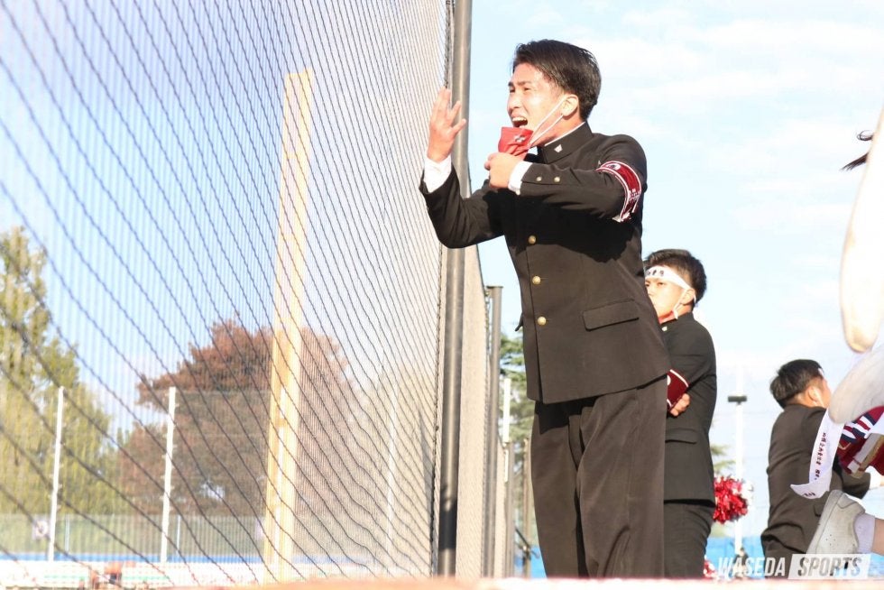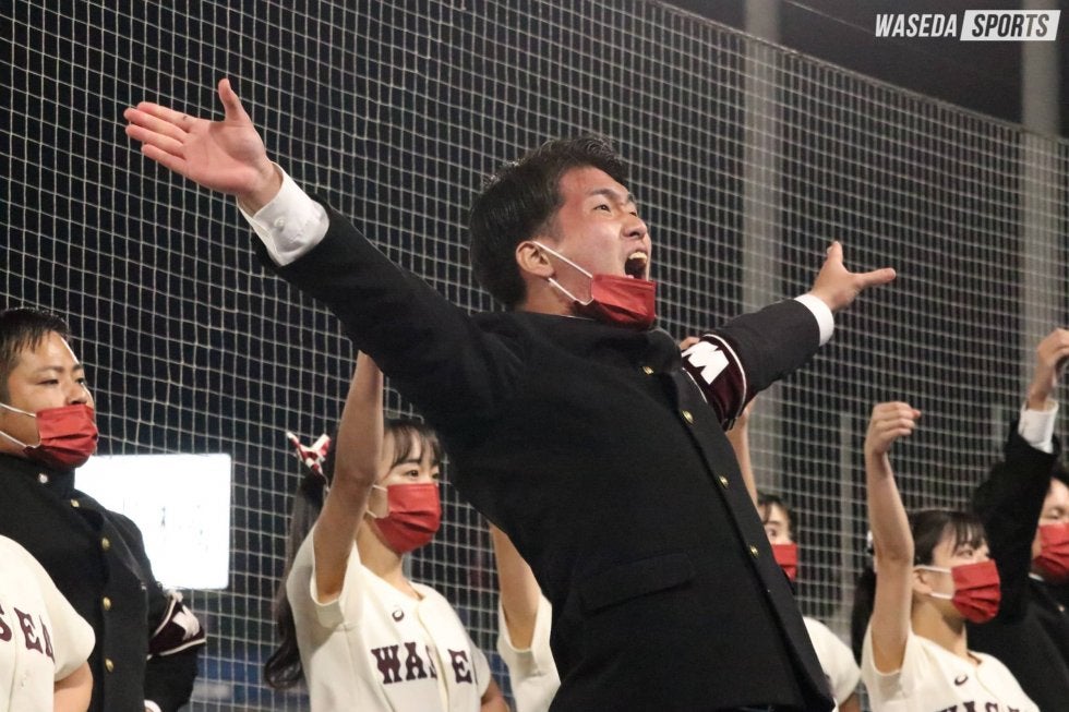 迎えた秋季リーグ戦。野球部は春季リーグ戦とは一転、好調なペースで勝ち星を積み重ねていった。3年ぶりに観客のそばの内野応援席に戻ってきた中、全体の応援の出来も春とは一転したと語る。「応援に対する意識が格段に変わった」。応援の連帯感が高まる中、齋藤の主将としての意識も変化していった。「主将としての責任は姿でも言葉でも引っ張ること」。どの部門にも所属しない代表委員主将という立場であるからこそ、全体を俯瞰して部員の努力を感じ取り、自身の原動力に変えていった。最終盤の早立戦、早慶戦では幾度となくピンチを迎えるが、齋藤は最前線で声援を送り、テクを振り、拳を突き続ける。そのがむしゃらな姿で主将らしく応援を引っ張り、野球部の勝利を後押しし続けた。そして早慶2回戦、9回裏。ここまで死に物狂いで応援してきた姿とは一転、指揮台からグラウンドの様子を静かに見守る。『打倒慶應』の瞬間を先頭で見届けると、観客へ直接感謝の言葉を贈った。セレモニーでは新人時代の代表委員主将・下田隆博氏(令2政経卒=東京・早大学院)に倣って2拍、2拍、4拍で校歌を堂々と振り切る。最後の明治神宮野球場(神宮)でこれまでの努力が実を結んだ齋藤。晴れ晴れとした表情で神宮を去った。