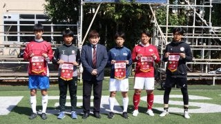 試合前にペナントを手にする選手たち 14日、早稲田大学とその系列校のサッカー部が集まるWASEDA ASICS CUP …