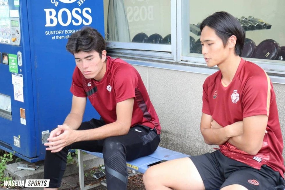 チームメートのGKヒル袈依廉(スポ3=鹿児島城西)(左)と対談をする平田