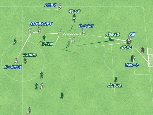 こうしてダビド・シルバはフリーでボールを受けることができ、前を向いた瞬間に久保が裏へ走り出すと絶妙なスルーパス。久保が冷静にファーサイドへ流し込んで先制点となった。