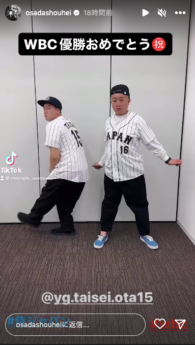 「WBC優勝おめでとう㊗️」と綴り、大勢選手の投球フォームを披露。相方の松尾駿は牧秀悟選手がシャンパンファイトの時に踊ったダンスを再現した。