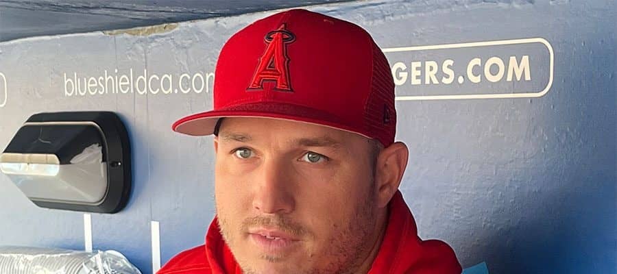 オープン戦前に取材に応じるエンゼルスのマイク・トラウト【写真:小谷真弥】