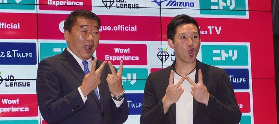 JDリーグの島田利正代表理事兼チェアマン(左)と元日本ハム・杉谷拳士氏【写真:宮脇広久】