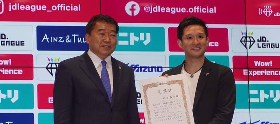 JDリーグの島田利正代表理事兼チェアマン(左)と元日本ハム・杉谷拳士氏【写真:宮脇広久】