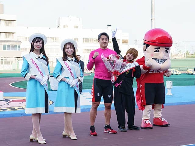 玉野競輪開設72周年記念「瀬戸の王子杯争奪戦」G3、最終日。ますます春の陽射しが強くなった場内では、本日もスペシャルトーショーや予想会、パフォーマンスショーなど賑わいを見せました。バンク内では、競輪選手会岡山支部の新人選手紹介を実施。まもなくデビューを迎える123期の5選手が、地元ファンの前で目標にする選手や意気込みを語りました。