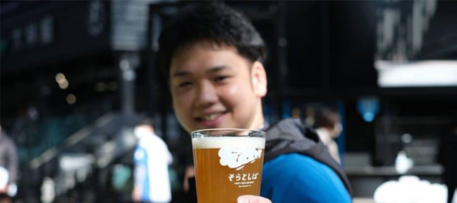 少し歩いてセンターバックスクリーンにあるクラフトビール醸造所レストラン「そらとしば byよなよなエール」のルーフトップへやってきました。6種類のクラフトビールがあり、「そらとしば」の名称のビールを醸造していて、エスコンフィールド内でしか飲めません。それぞれのクラフトビールにはコンセプトがあり、さっそく僕は「Play Ball! Ale(プレイボールエール)」をいただきました。